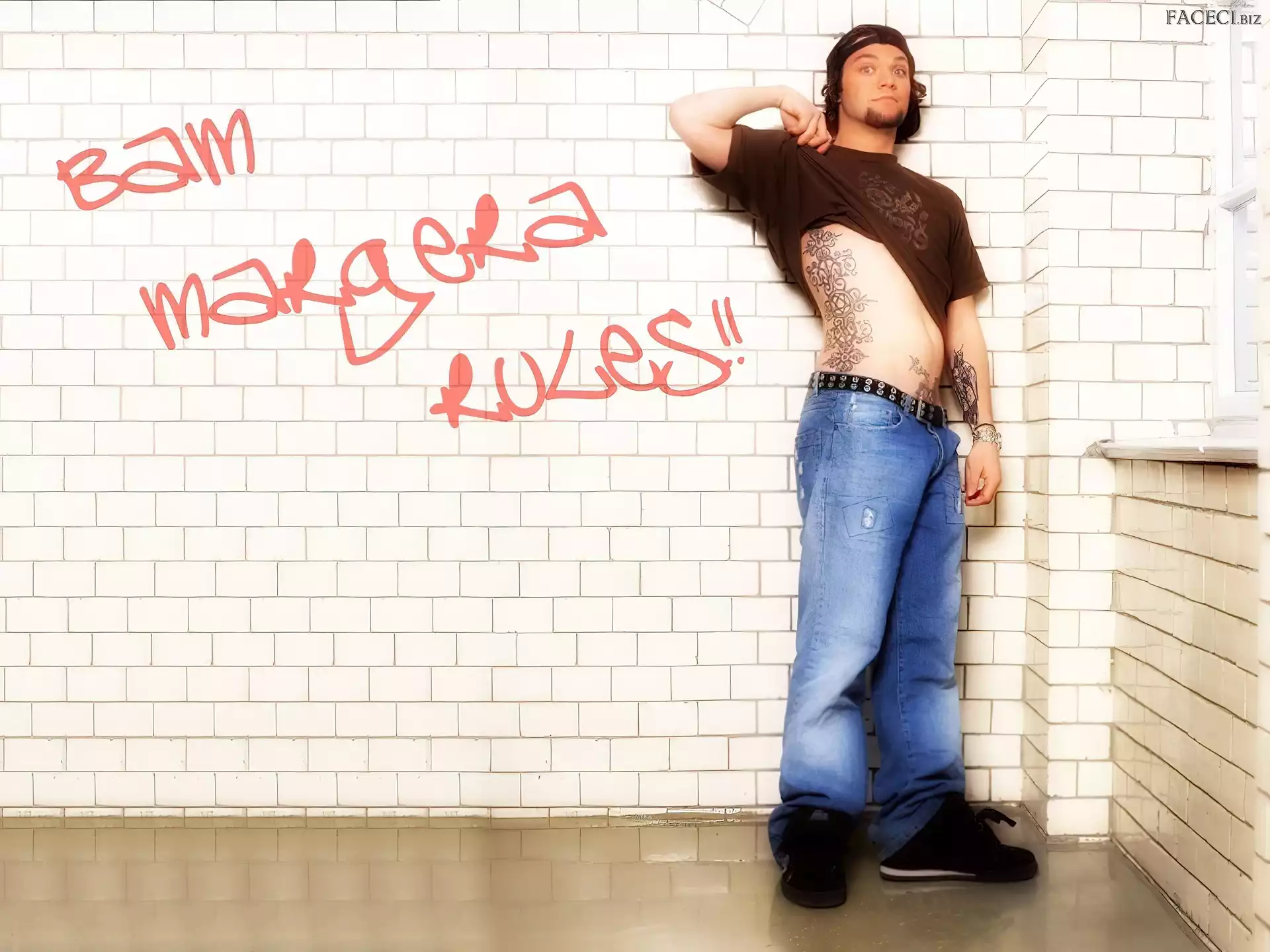 t-shirt, Bam Margera, brązowy okulary, Bam Margera, butelka okulary, Bam Margera, twarze kurtka, Bam Margera, rozpięta zegarek, Bam Margera, deskorolka włosy, Bam Margera, ciemne